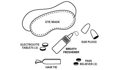 Kit contains: an eye mask, electrolyte tablets, breath freshener, ear plugs, hair tie and pain reliever.